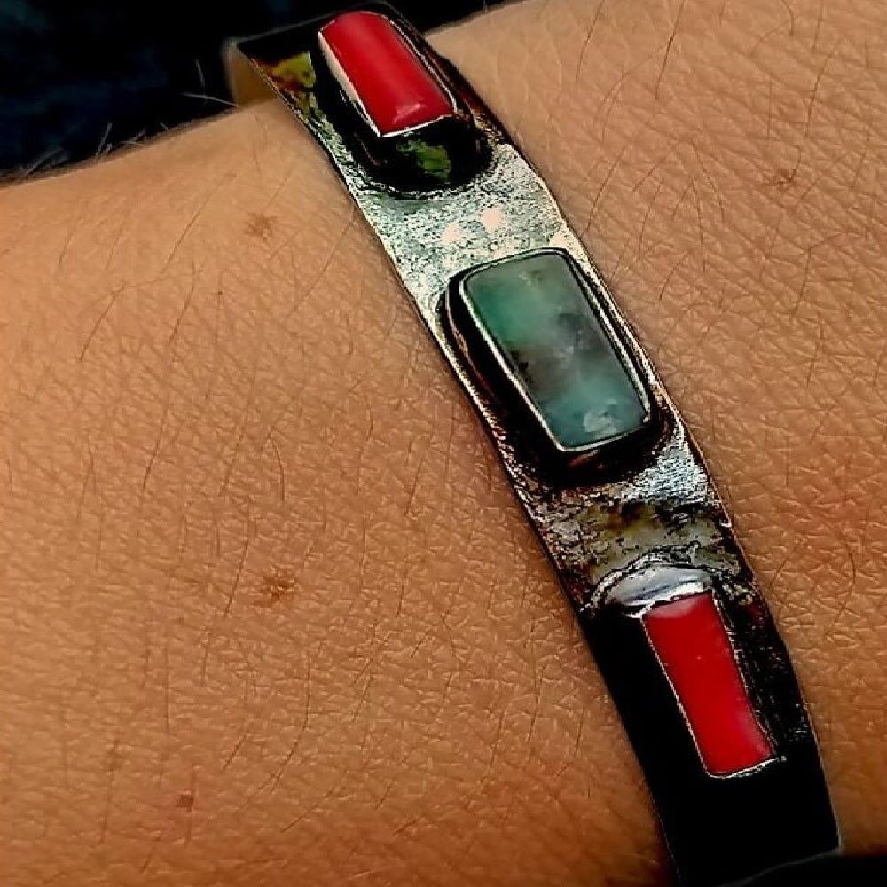 925 sterling silver. Natural coral and turquoise stone coating setting. Entirely hand-forged. Hand-forged. Please provide your wrist size when ordering.